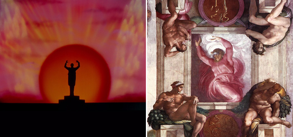 Stokowski is not of course Mickey’s creator, but his role conducting the music of Fantasia does give him a certain “godlike” status within the film’s animated worlds — a status overtly evoked in the opening sequence, Bach’s “Toccata and Fugue in D Minor,” with Stokowski’s silhouette superimposed over abstract shapes and colors, rays of light leaping skyward at the conductor’s gestures. This sequence of light and darkness, coming at the very beginning of the film, corresponds strikingly with the first panel in the chapel ceiling, the creation of light and darkness on the first day of creation.
