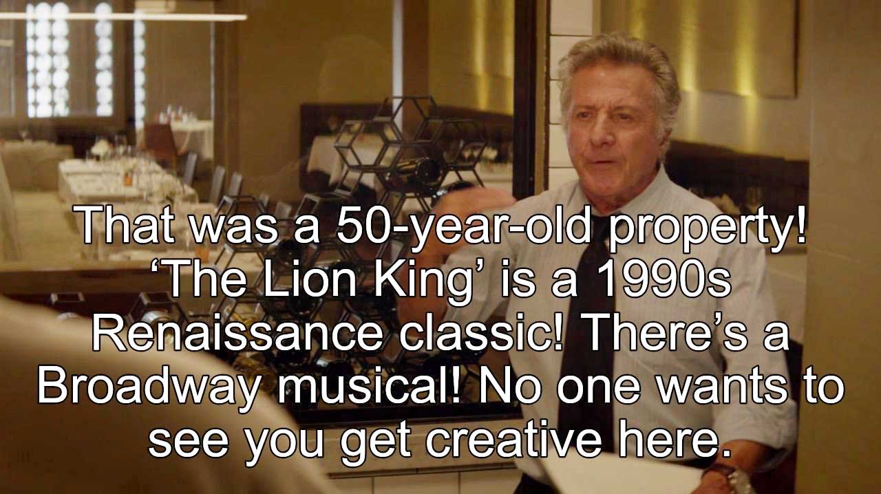 That’s when it hit me: The nouveau Lion King is just like the opening act of Favreau’s Chef: Favreau is literally Carl, and Disney is Dustin Hoffman. If you haven’t seen Chef, this may not entirely make sense. Then again, if you haven’t seen Chef … why on earth not?
